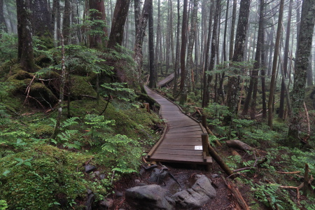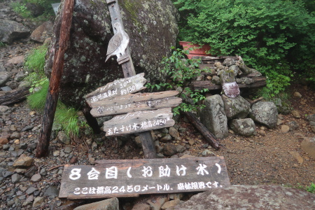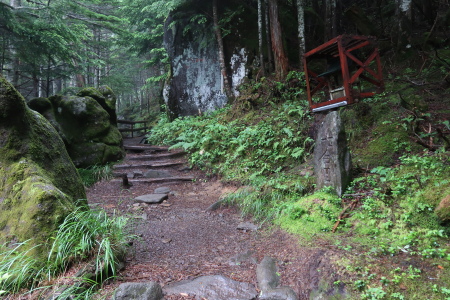 | 濁河温泉登山口から継子岳を目指します。登山道が変わっていました。川を渡るルートでなく、散策路からのルートに変わっていました。 途中崩壊しているとの事。目的は「コマクサ」の花を撮ること。今回は残念」でしたが、五の池小屋に到着したころ、強風と霧。早々に下山しました。 |