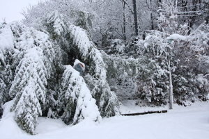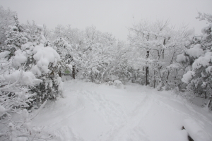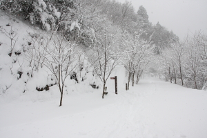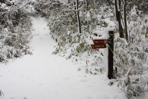 分岐からは所々で松の木が雪で倒れ、道をふさぐ。ストックでたたいて雪を落としながら進んで行く。
