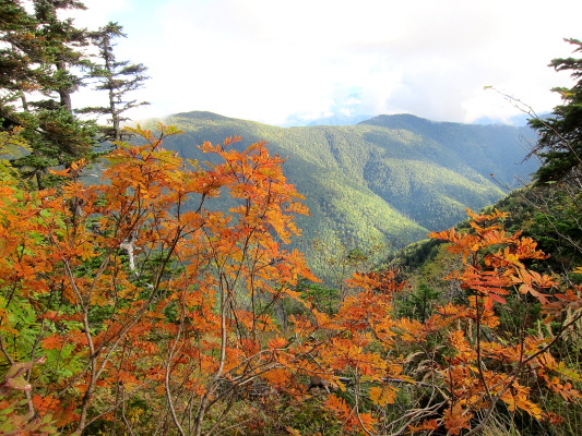 やっと長塀山に着いた。これからまだ1時間はある。樹林帯を抜けて、稜線が目の前に現れた。チョット休憩していると、ホシガラスが前を横切った。