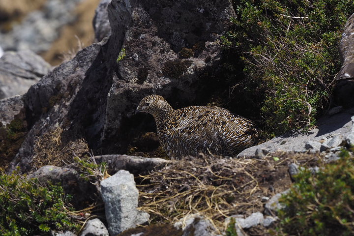 大喰岳の頂上付近で昨日会ったライチョウの番に会った。オスが笠ヶ岳をバックに居たので、急いでコンパクトデジカメを出してAUTOで撮った。