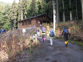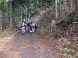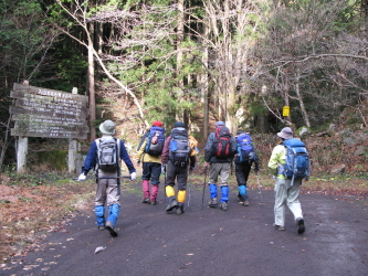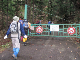 管理棟の横を通り、林道に出てしばらく進むとゲートがあり、横を抜けて、さらに進むと右手に登山道の案内がある。(帰りはここに下りてきた)