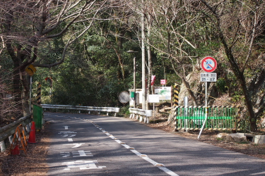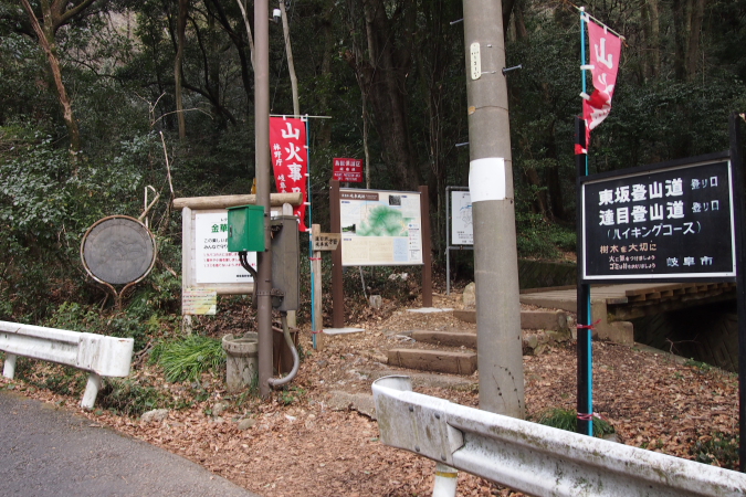 | 金華山ドライブウェーの車での通行可能時間はAM7:00〜PM9:00 土日祝祭日は岐阜公園側の夕陽丘入口から金華山展望公園までの区間は 一方通行規制で公園側へは降りることはできませんが、違反者が多数みられる。 右側に、登山口が見えます。 |