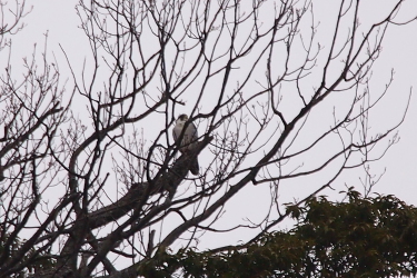 | ハヤブサが対面の木に止まっています。 雄です。雌も近くにいるのですが分かりませんでした。 |