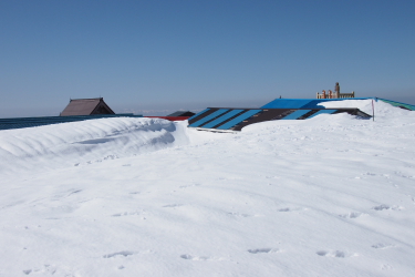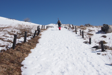 さ〜出発。予定より30分遅れで出発。五合目から六合目の避難小屋付近までは、雪がありませんでした。六合目から九合目まで直登のコースです。