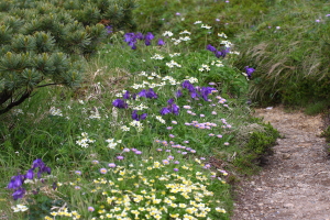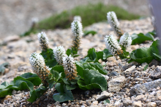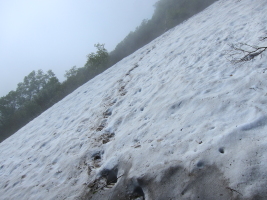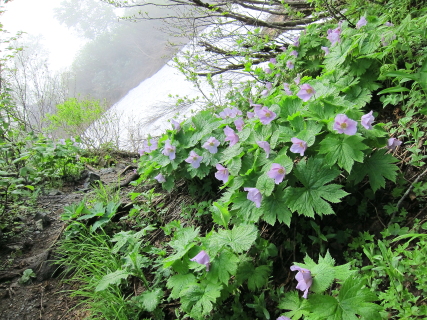 この笹薮、まだこれからも所々に現れます。頂上直下の吹き通しに来たら、一面の花。ユウバリソウが咲いていました。