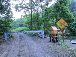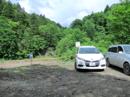 林道を進むと、途中で通行止め。7km手前で。チョット先が崖崩れの恐れがあると言う事で。ゲートの手前に駐車スペースが作られています。