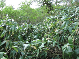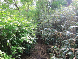 馬の背コースと出合って、稜線に出ましたが、激しい笹薮にルートは隠れています。露払いです。ズボンはずぶ濡れ。